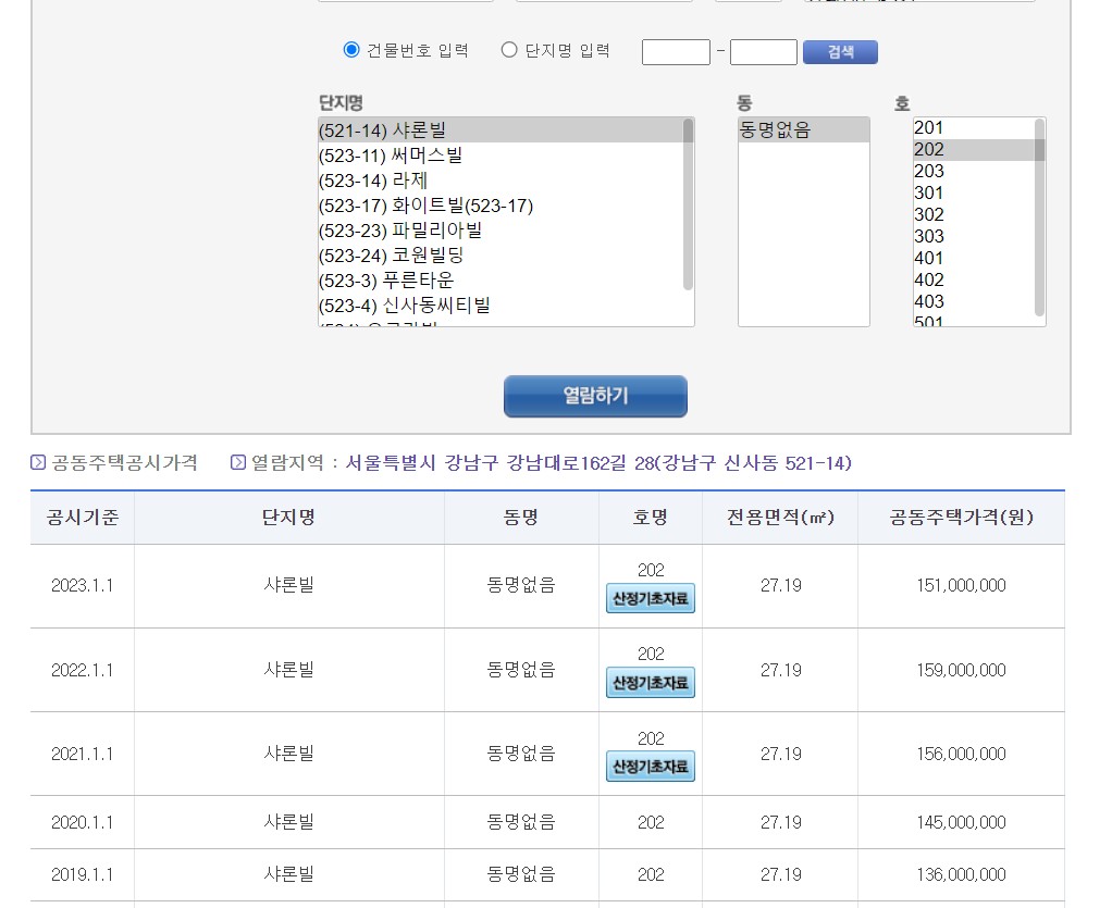 4.동 호수를 선택하시면 전용면적과 년도별 공시기준 가격이 나옵니다