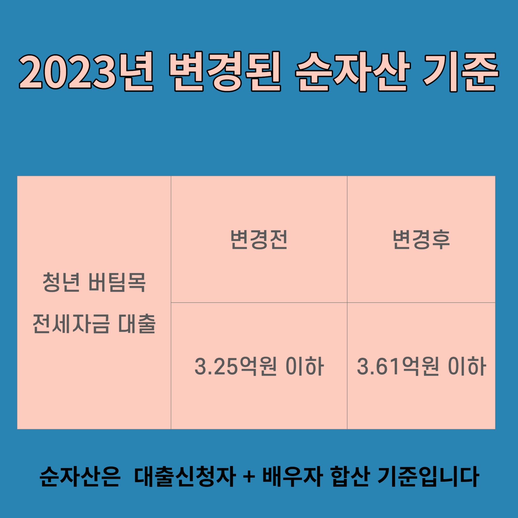 - 대출 신청자와 배우자의 합산 순자산 가액이 3.61억원 이하인 자 (2022년 기준은 3.25억원 이하였으나 2023년 이후로는 3.61억원 이하)